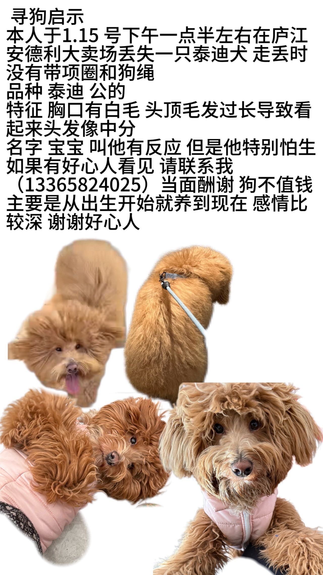 庐江找狗泰迪 1.15号下午一点半在庐江安德利大卖场丢失 狗